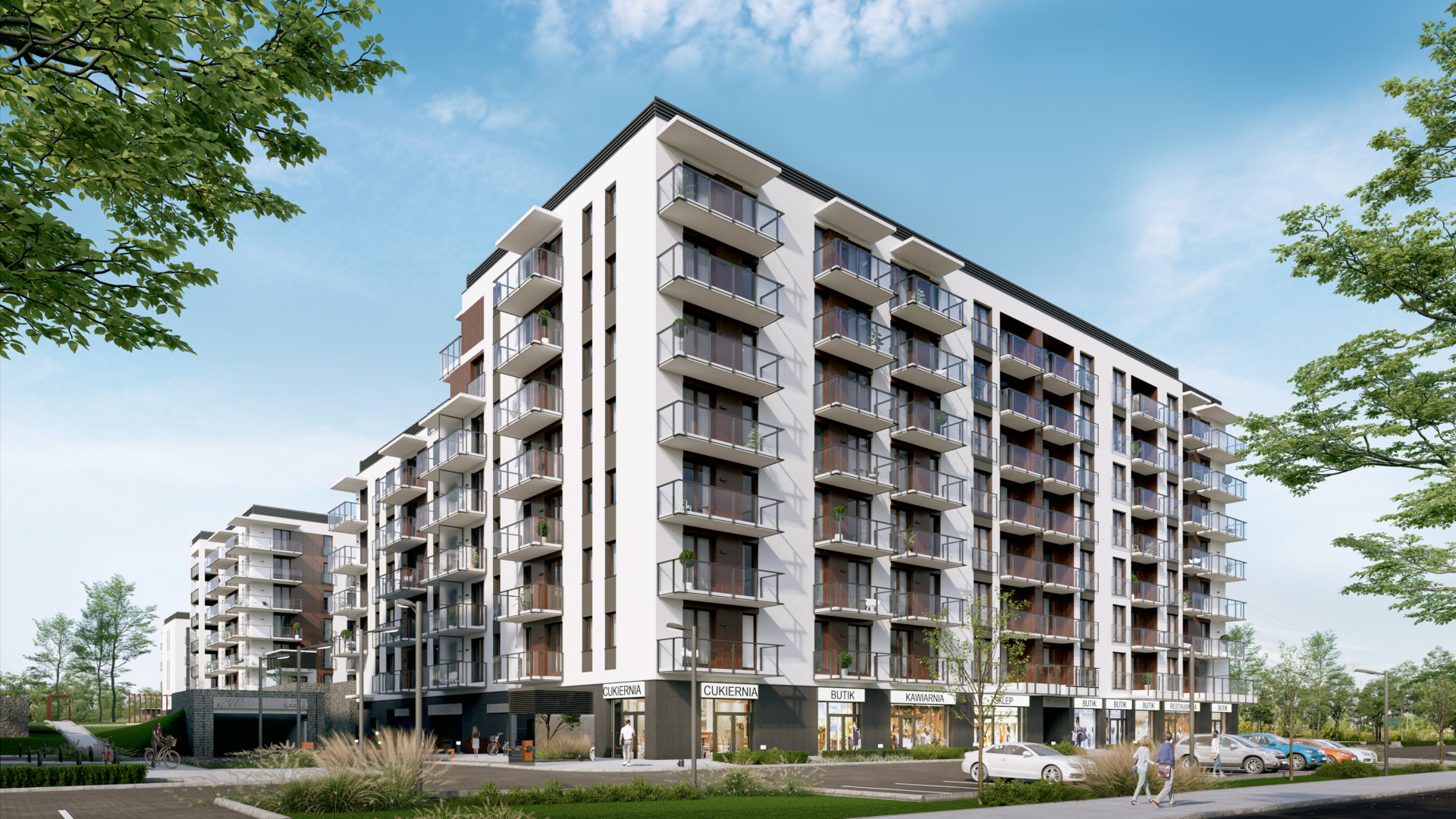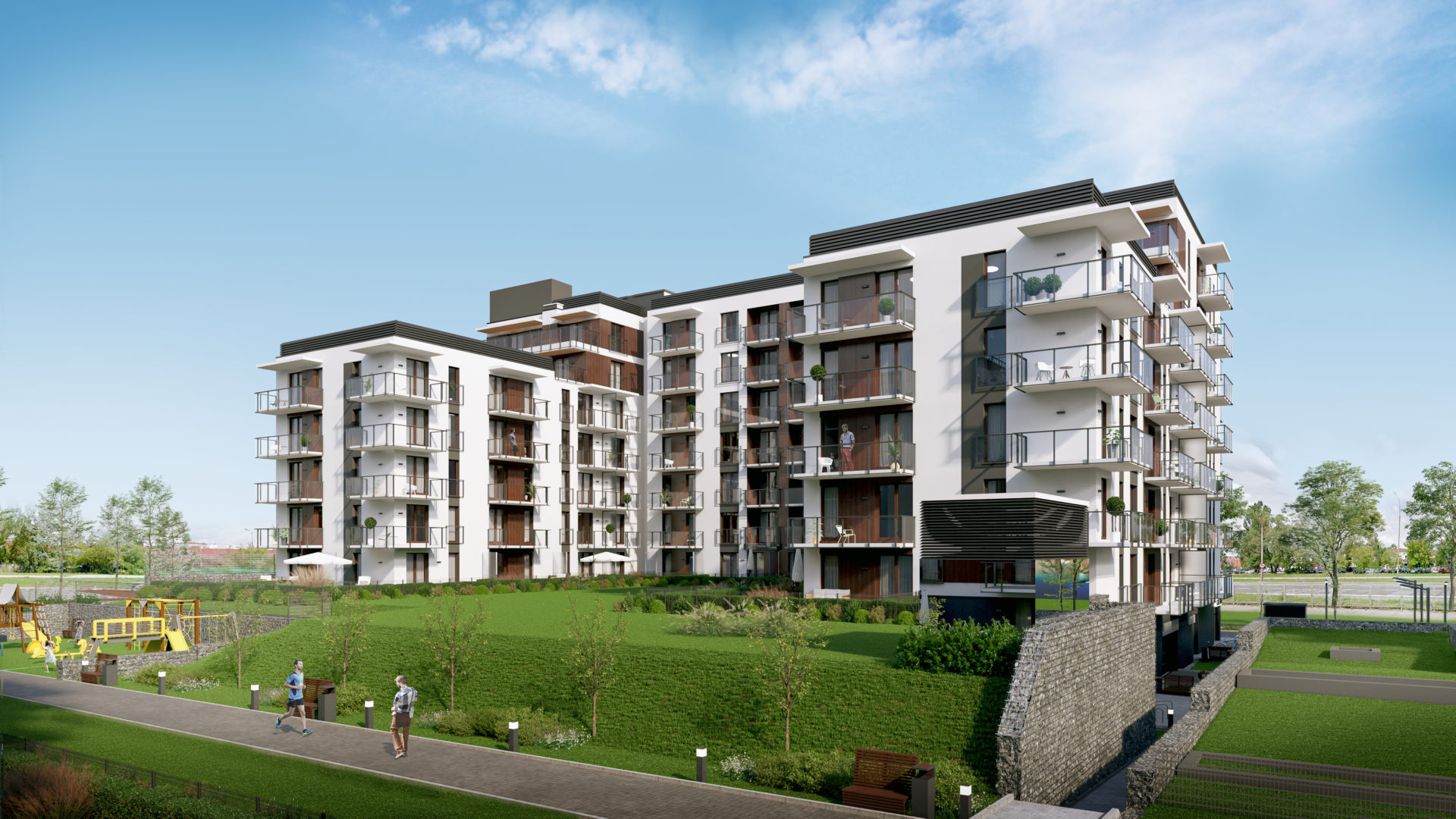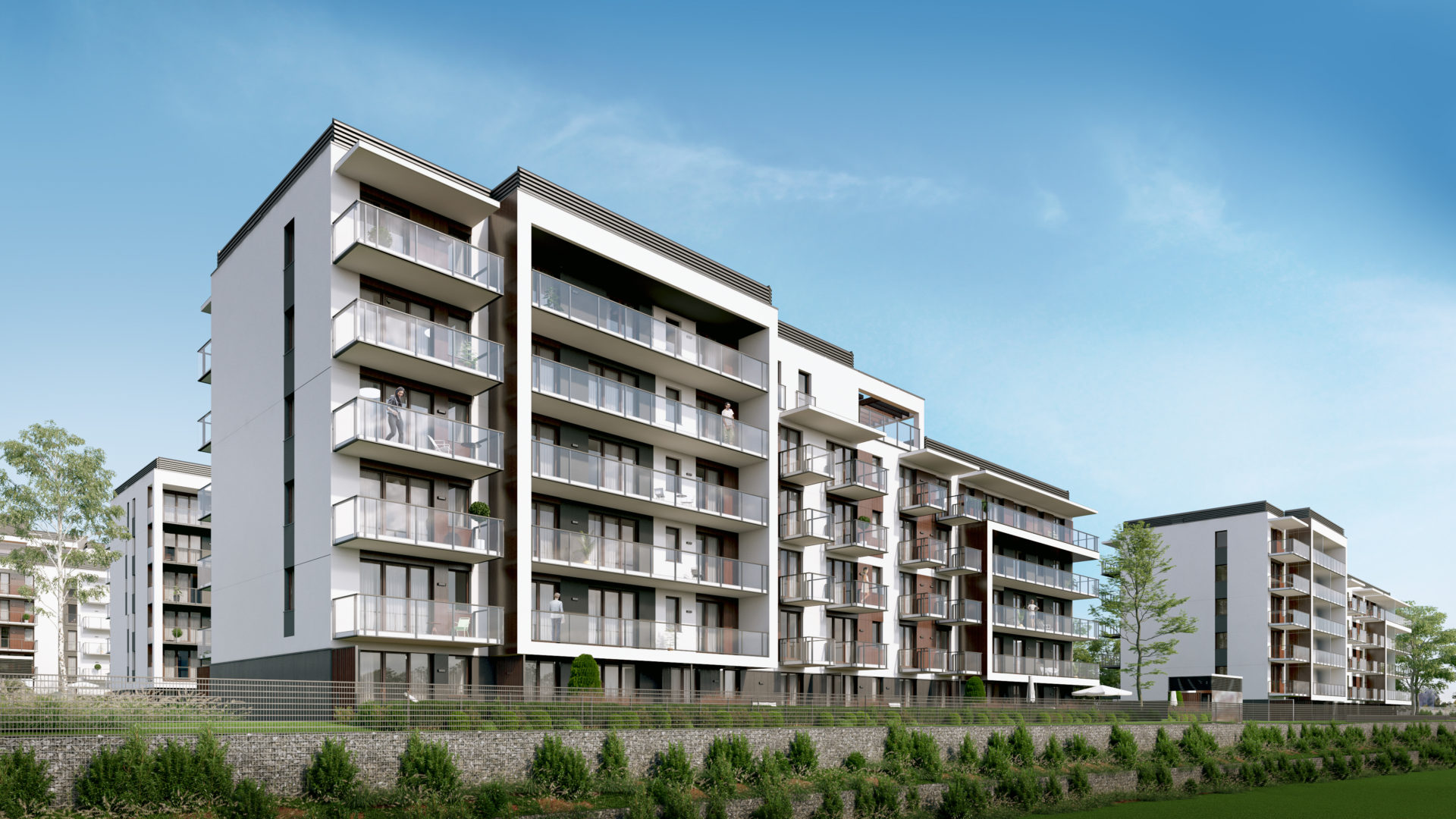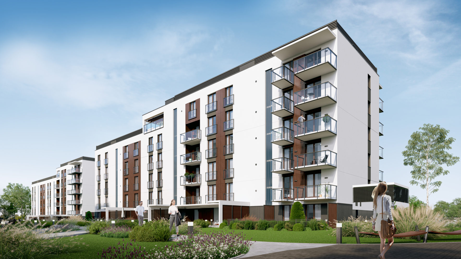 Elewacje budynków posiadają zróżnicowane płaszczyzny poprzez różnorodne wysunięcia ścian zewnętrznych i balkonów oraz poziome i pionowe podziały materiałowe nadające im dynamiczny i nowoczesny charakter architektoniczny. Wprowadzone zostały ciepłe odcienie drewna i szkło, dodające lekkości.