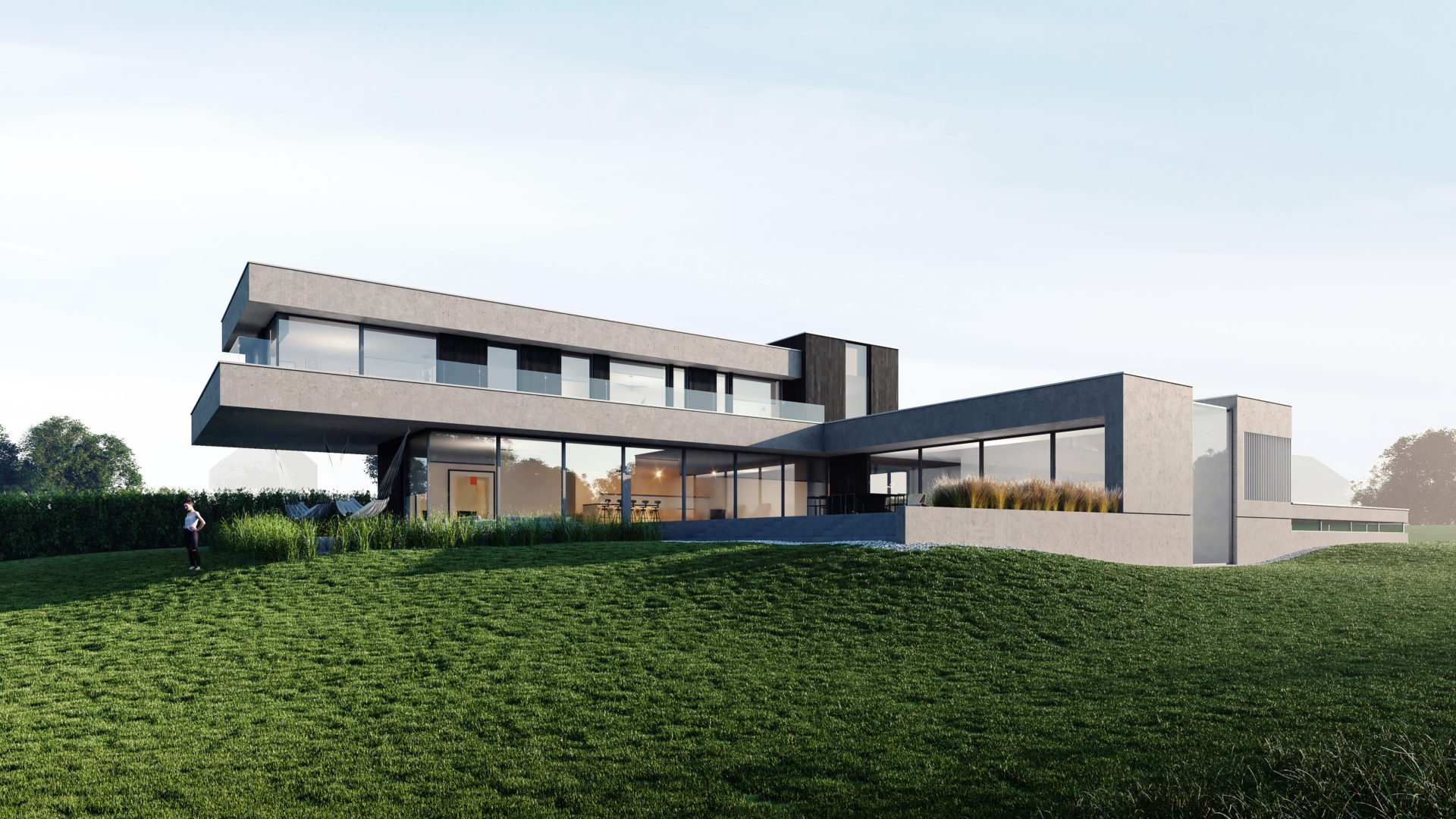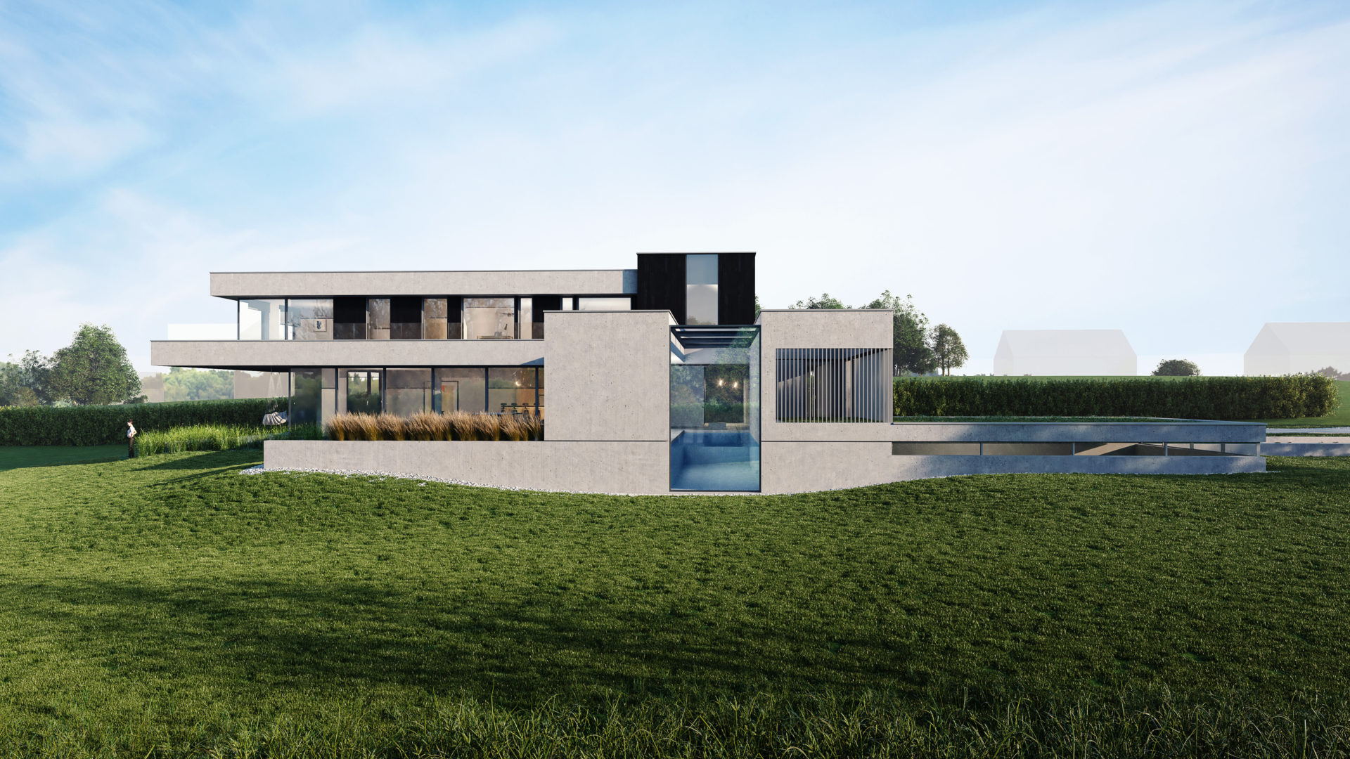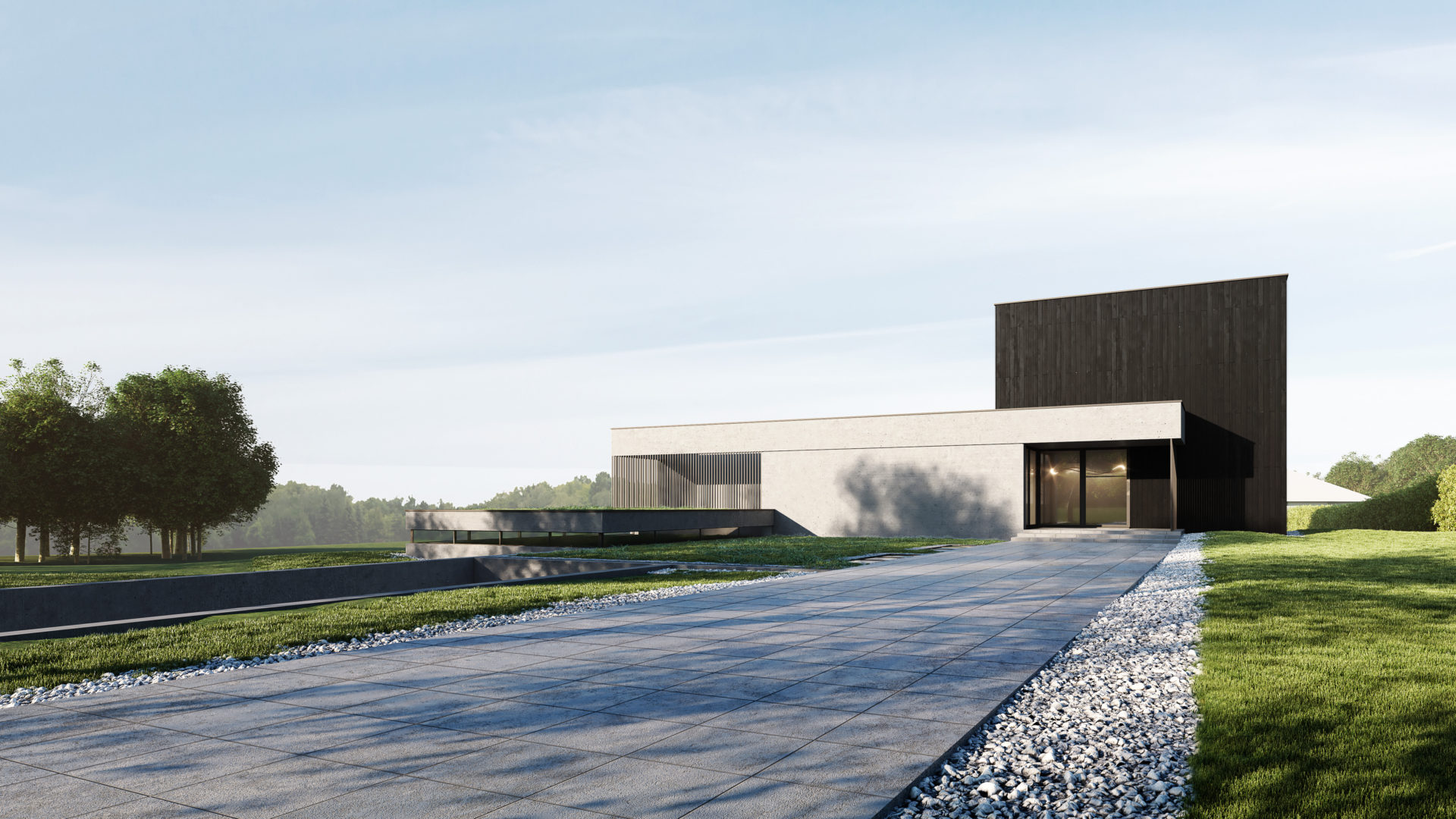Elewację frontową stanowi fasada północno-wschodnia od strony projektowanej drogi dojazdowej, gdzie zlokalizowano główne wejście do budynku. Zadaszone wejście prowadzi przez komunikację do części dziennej oraz basenowej na parterze. Wyższa kondygnacja (strefa nocna) oraz niższa (strefa techniczno-garażowo-sportowa) połączone są biegami schodowymi zlokalizowanymi w centralnym punkcie domu.