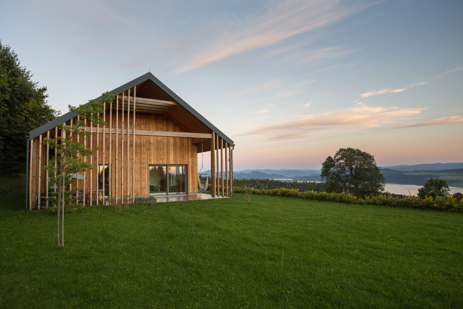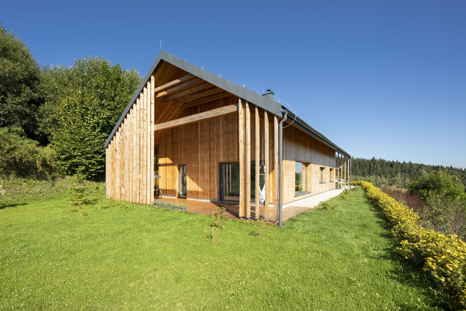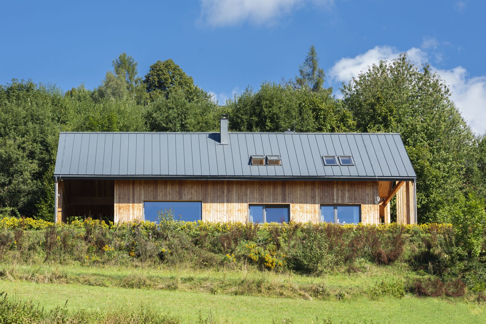 Architektura budynku to nowoczesne przetworzenie tradycyjnej bryły z dachem dwuspadowym. Współczesny charakter bryły podkreśla umiarkowany, nowoczesny detal oraz duże przeszklenia. Dach kryty blachą tytanowo – cynkową na rąbek stojący w kolorystyce ciemnej, elewacje obłożone drewnem modrzewiowym oraz szarym tynkiem, elewacje budynku gospodarczego również obłożone drewnem modrzewiowym. Obróbka blacharska systemowa ciemna – w kolorze dachu. Budynek mieszkalny charakteryzuje wyraźny podział na strefę dzienną oraz nocną. Kotłownia została zlokalizowana na parterze zaraz przy głównym wejściu do budynku mieszkalnego. Z części dziennej salonu z kuchnią można się dostać na poziom poddasza poprzez wewnętrzną klatkę schodową. Na poddaszu znajdują się dwie sypialnie, strefa wypoczynku z sauną oraz łazienka. Za wejściem głównym do budynku po lewej stronie korytarza znajdują się dwie dodatkowe sypialnie. Schodami zewnętrznymi dostajemy się do piwnicy, gdzie znajdują się dwa pomieszczenia.
