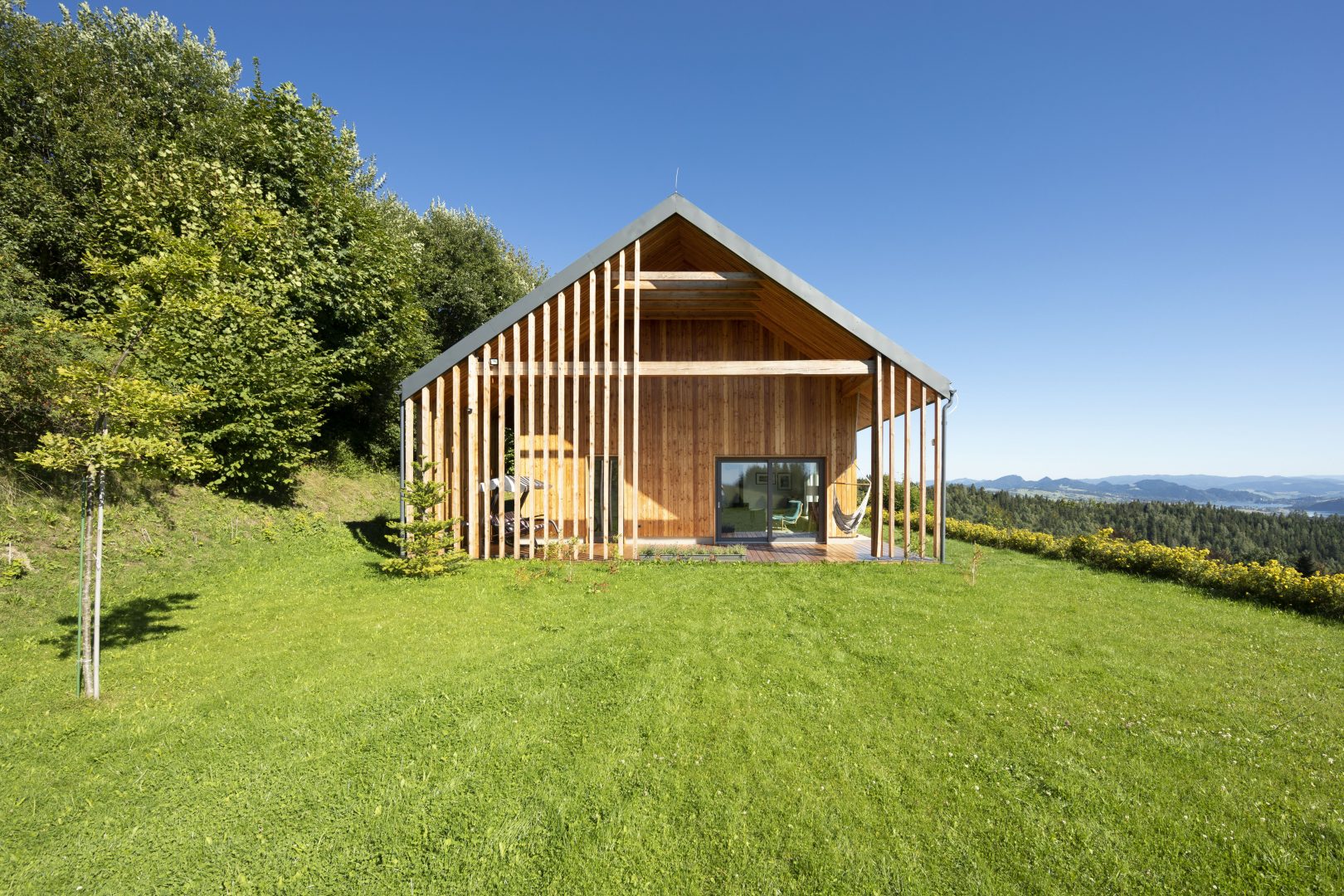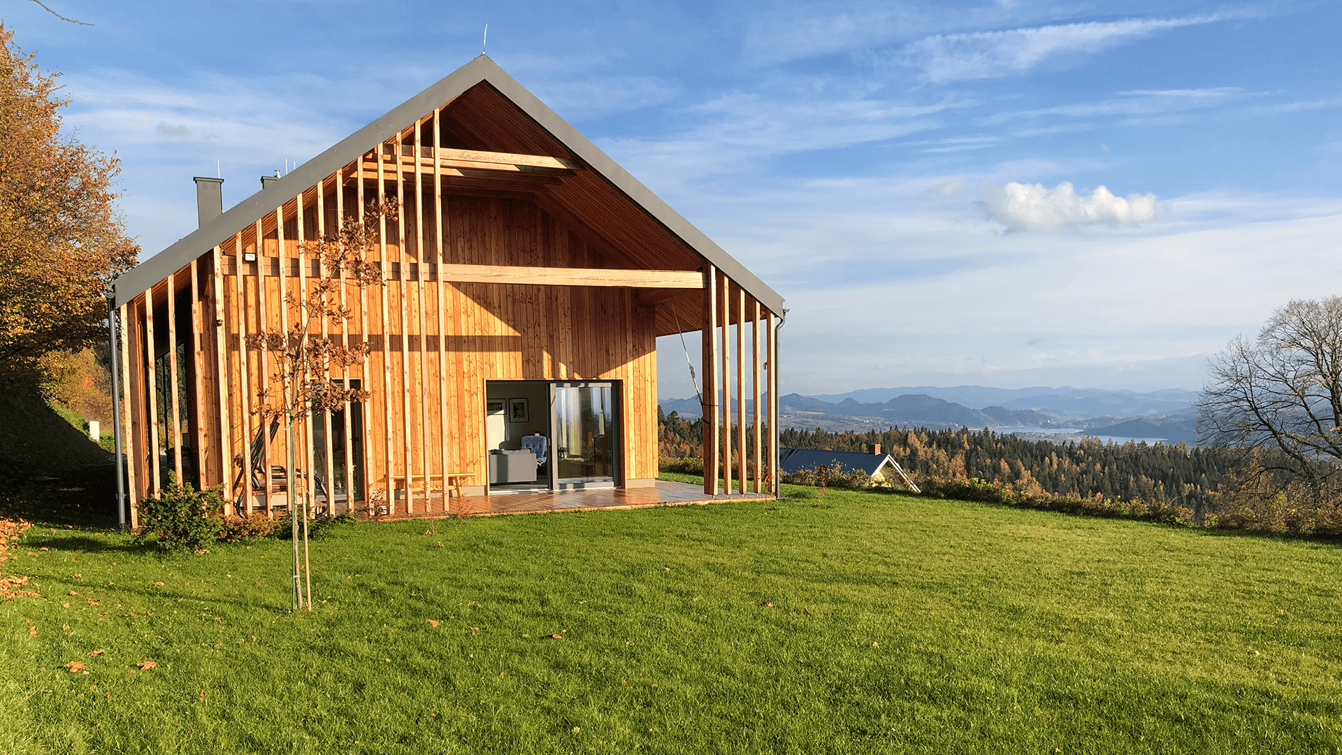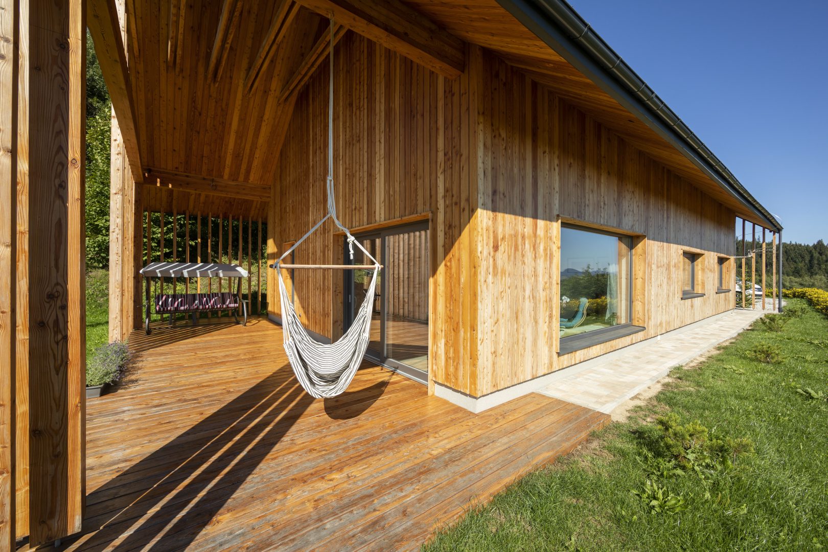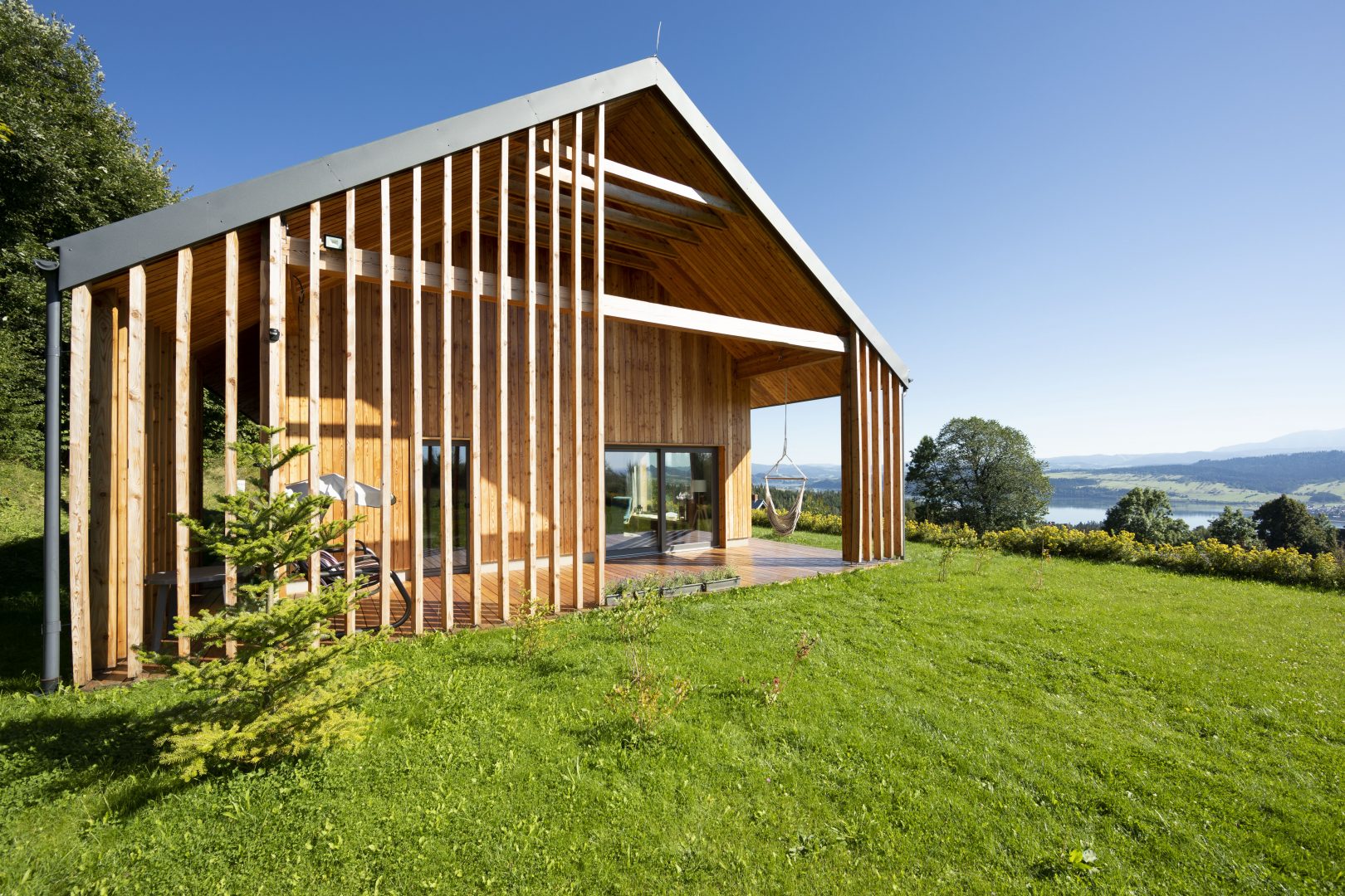 Architektura budynku to nowoczesne przetworzenie tradycyjnej bryły z dachem dwuspadowym. Współczesny charakter bryły podkreśla umiarkowany, nowoczesny detal oraz duże przeszklenia. Dach kryty blachą tytanowo – cynkową na rąbek stojący w kolorystyce ciemnej, elewacje obłożone drewnem modrzewiowym oraz szarym tynkiem, elewacje budynku gospodarczego również obłożone drewnem modrzewiowym. Obróbka blacharska systemowa ciemna – w kolorze dachu. Budynek mieszkalny charakteryzuje wyraźny podział na strefę dzienną oraz nocną. Kotłownia została zlokalizowana na parterze zaraz przy głównym wejściu do budynku mieszkalnego. Z części dziennej salonu z kuchnią można się dostać na poziom poddasza poprzez wewnętrzną klatkę schodową. Na poddaszu znajdują się dwie sypialnie, strefa wypoczynku z sauną oraz łazienka. Za wejściem głównym do budynku po lewej stronie korytarza znajdują się dwie dodatkowe sypialnie. Schodami zewnętrznymi dostajemy się do piwnicy, gdzie znajdują się dwa pomieszczenia.