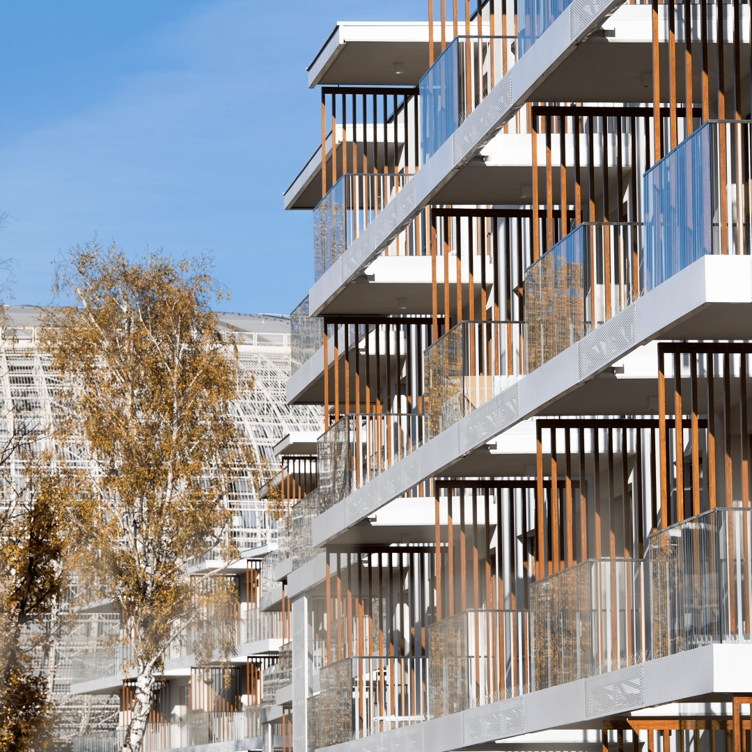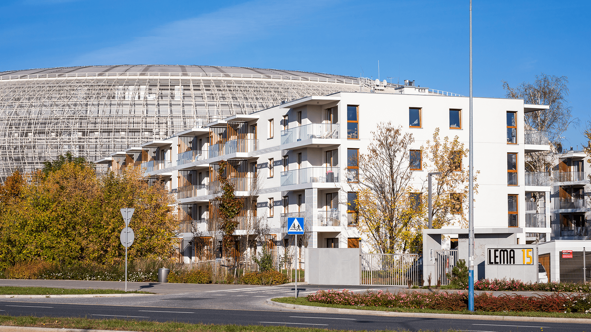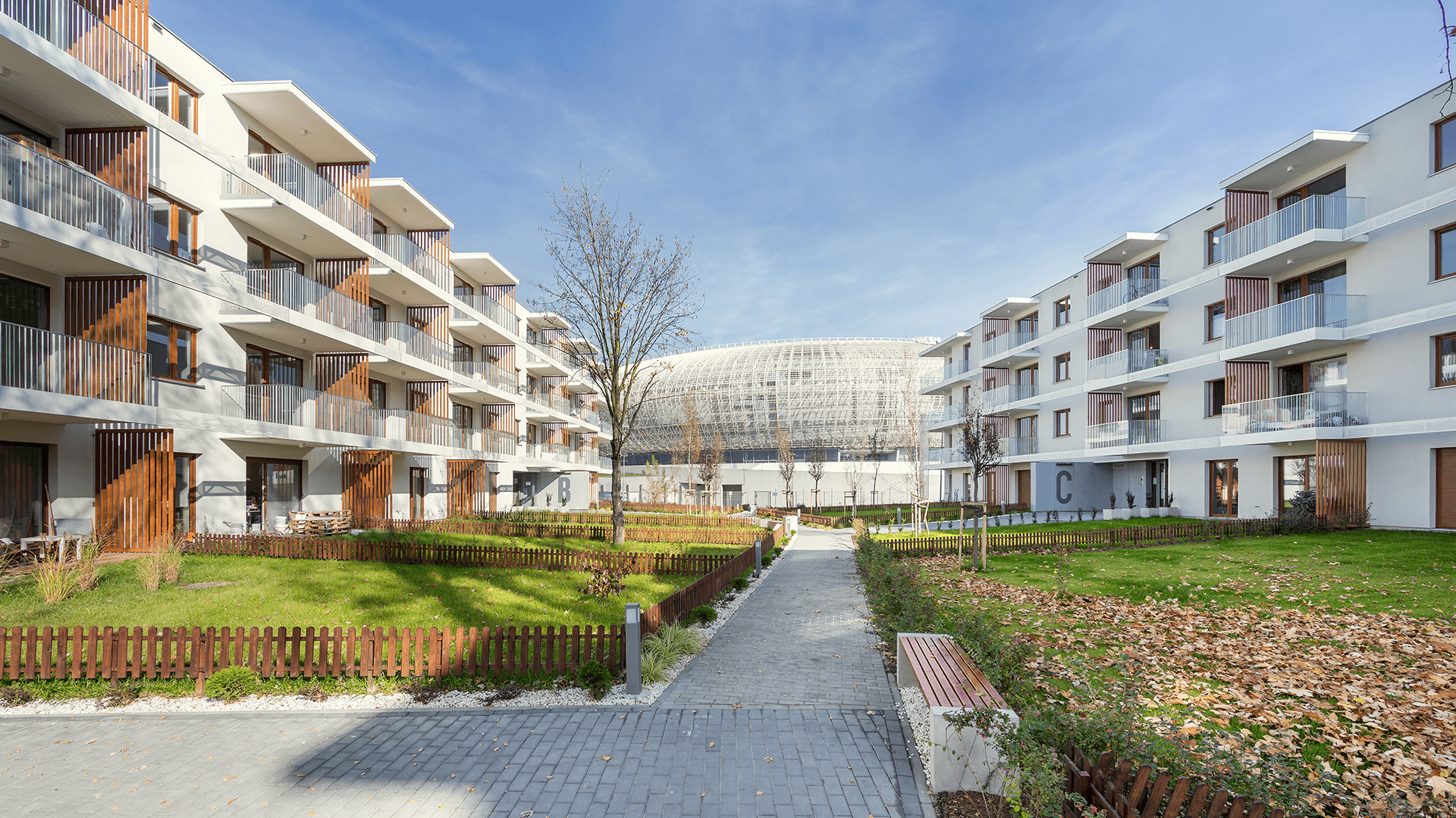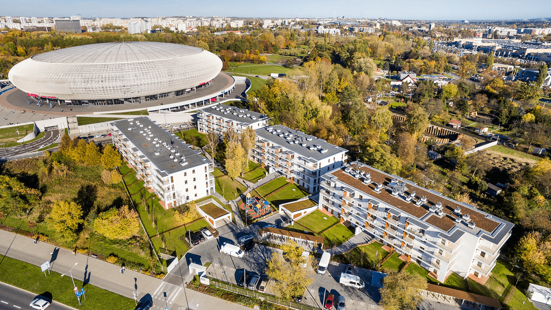 Zespół zabudowy wyposażono w podstawowe instalacje wewnętrzne: wod.-kan., c.o., elektryczne siły i światła, telefoniczną, internetową, odgromową, wymiennikownie oraz wentylację mechaniczną garażu i instalacje teletechniczne. Na obszarze objętym inwestycją zaprojektowano również zewnętrzne oświetlenie drogi dojazdowej, chodników, placu zabaw i terenu rekreacyjnego. Przedmiotowe budynki mieszkalne wielorodzinne kompozycyjnie ukształtowane są równolegle do siebie po wschodniej i zachodniej części działki. Dzięki temu tworzą niejako obramowanie dla widoku na Arenę widowiskową patrząc wzdłuż osi wewnętrznej założenia. W rzucie poziomym budynki posiadają kształt prostokątów. Każdy z nich posiada inną długość. Elewacje przedmiotowych budynków posiadają zróżnicowane płaszczyzny poprzez wcięte balkony na narożnikach, balkony o różnej długości oraz poziome podziały materiałowe nadające budynkom dynamiczny i nowoczesny charakter architektoniczny. Ażurowe pergole nad ostatnią kondygnacją powodują efekt załamanych cieni i pełnią rolę łamaczy światła dzięki czemu bryła staje się jeszcze bardziej rozrzeźbiona. Parterowe mieszkania posiadają ogródki i tarasy dla stworzenia kameralnej atmosfery dla mieszkańców. Ogródki wydzielone są ze strefy wspólnej niskimi murkami i zielenią izolacyjną. Budynki wykonane są w technologii tradycyjnej. Konstrukcje podziemne stanowią żelbetowe układy słupowo-płytowe, konstrukcję naziemną stanowią układy płyt żelbetowych i ścian nośnych murowanych ceramicznych. Stropy i stropodachy wykonane będą z żelbetu. Projektowana jasna kolorystyka ścian i balkonów tworzy nowoczesną i lekką bryłę budynków, w stylu minimalistycznym.
