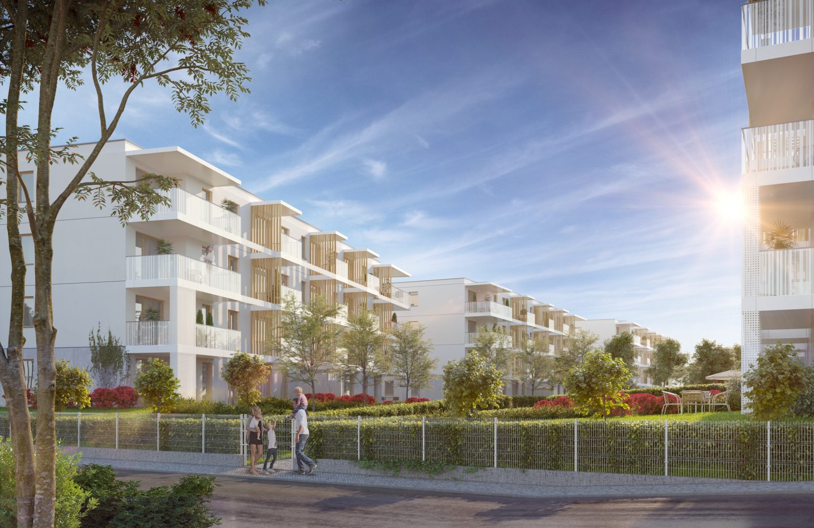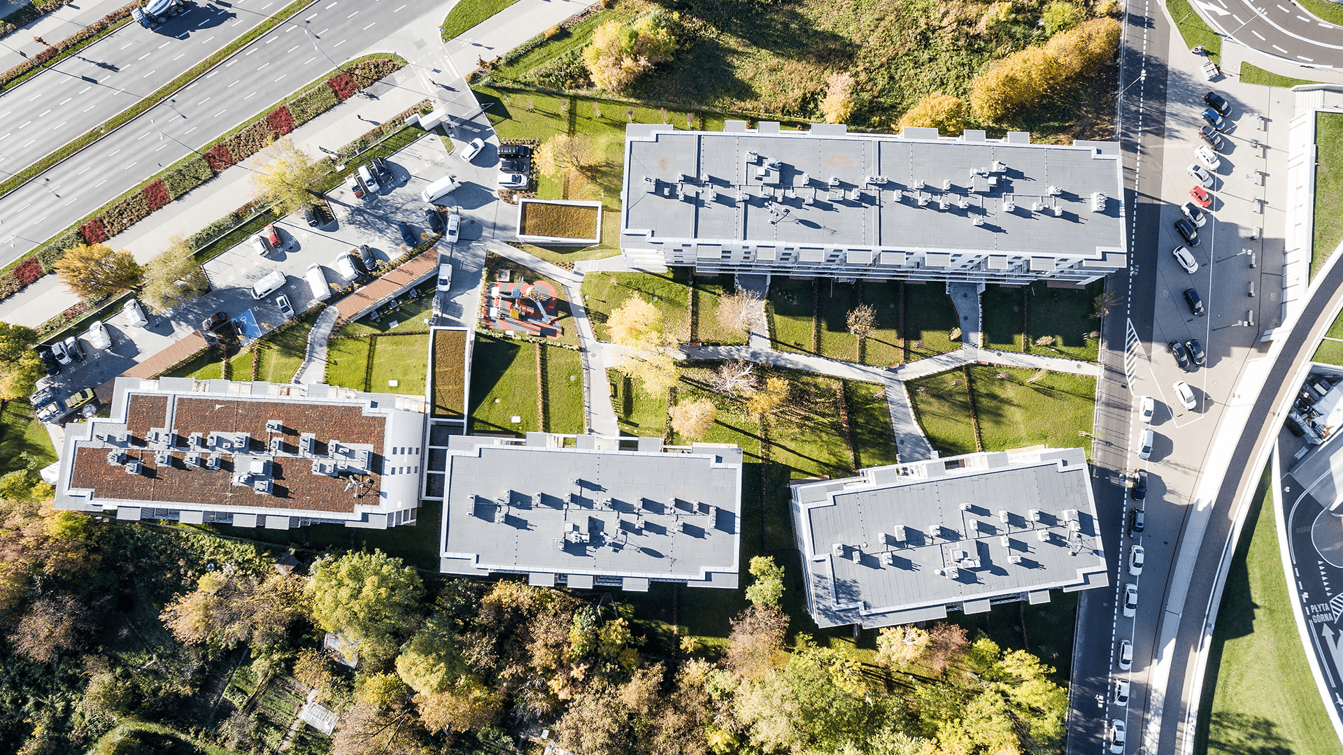 Osiedle zaprojektowane na działce o pow. 1,17ha składa się z czterech, 3-piętrowych budynków, w których znalazło się łącznie 191 mieszkań, z czego 21 mieszkań jednopokojowych, aż 118 dwupokojowych, 49 trzypokojowych i 3 czteropokojowe (o metrażach wahających się od 26 do 97m2). Wjazd na teren projektowanego założenia znajduje się od południowo – zachodniej strony skąd zaprojektowany jest wewnętrzny układ drogowy z zadaszonymi wjazdami do poszczególnych garaży. Po zachodniej stronie działki wzdłuż ciągu pieszo – jezdnego prowadzącego do garażu jednego z budynków zlokalizowane są pogrupowane zewnętrzne miejsca postojowe w liczbie 48. Wejścia do budynków znajduje się od strony wschodniej i zachodniej. Obiekty ustawione są niemalże równolegle do siebie wzdłuż dłuższych boków w osi północny wschód – południowy zachód. Projektowane budynki posiadające cztery kondygnacje nadziemne są w całości podpiwniczone, w których projektuje się 3 garaże podziemne: jeden dla budynku 1 (segment 1A i 1B), jeden dla budynku 2 segment 2C i 2D) oraz jeden dla budynku 3E.